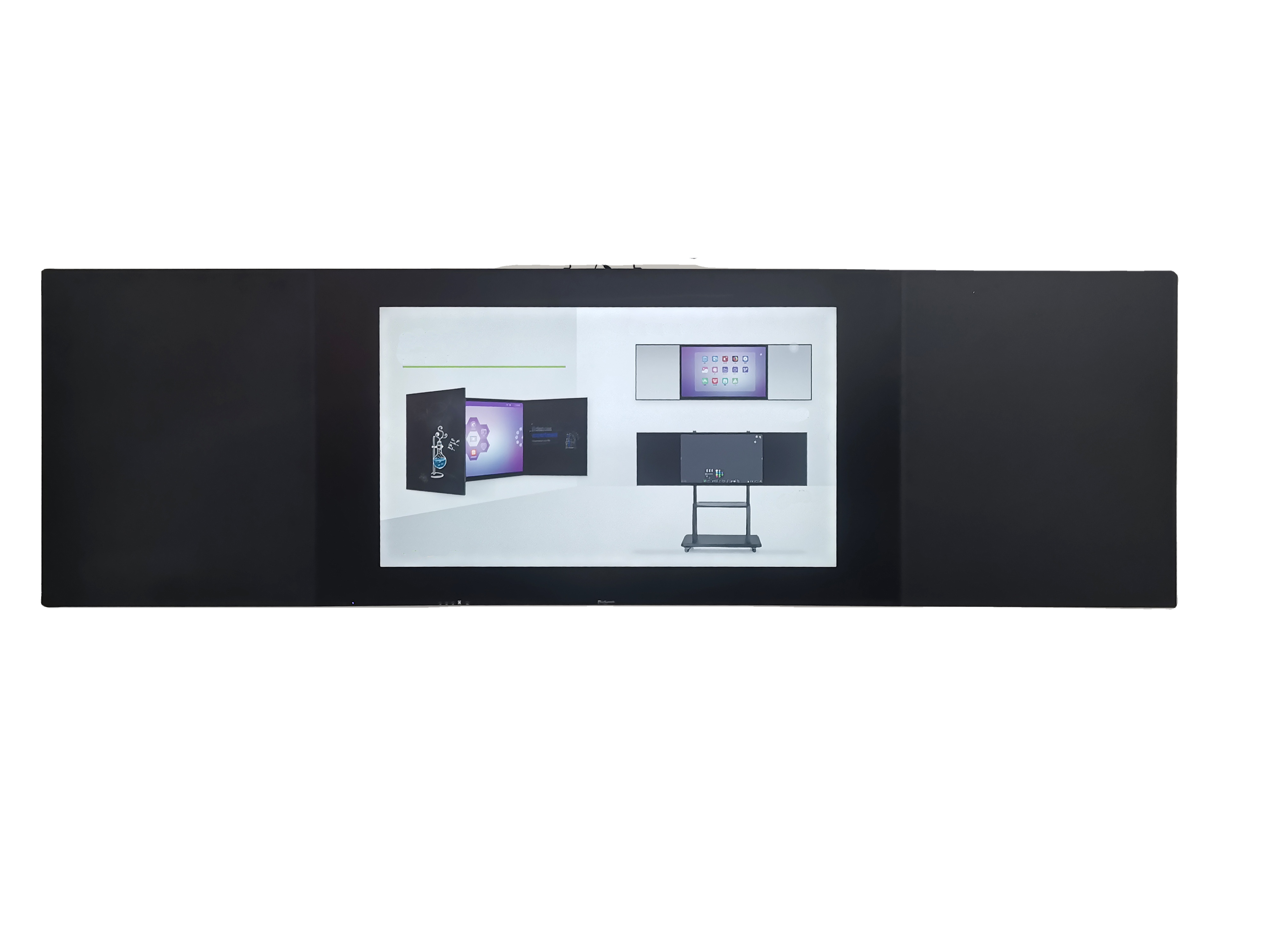Our 75 inch or 86 inch 4k UHD Lcd Touch Screen Smart Board Finger Interactive Whiteboard Panel Pc Touchscreen Monitor For conference combines interactive display and traditional blackboard together. It integrates with a capacitive LED Interactive display in the central and two foldable writable surface wings on the two sides is suitable for large conference rooms. Supports 30-point touch in windows mode and 10-point in android writing interactive functions, built-in android 8.0 OS with Conference system (UMind), multimedia publish app (UShow), and professional file management app (UFile),